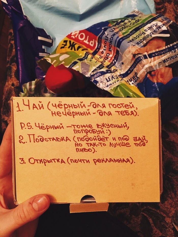 Дальше я нашла вот такую коробочку с инструкцией. На сайте АДМ я упоминала, что не пью черный чай, а также, что я собираю подставки под пивные кружки и рекламные открытки с интересным дизайном, и моя снегурочка позаботилась об этом. Спасибо!