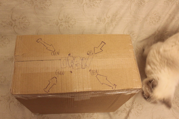 Вчера у меня было день рождения и почта меня порадовала - пришла посылочка из Краснодара от анонимного деда мороза. Сегодня я отправила подарок своей "внучке" из Подольска, а также забрала небольшую, но увесистую посылку (2 с половиной кг) с подарками. Придя домой, первым делом пригласила котоинспектора, который, правда, весьма вяло отреагировал на коробку.