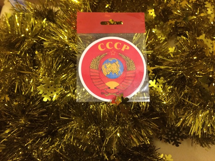 И первое, что я вижу, как на фоне золотой мишуры, как на золотом снопе спелых колосьев с полей нашей прекрасной страны, лежит восхитительная наклейка с гербом СССР.