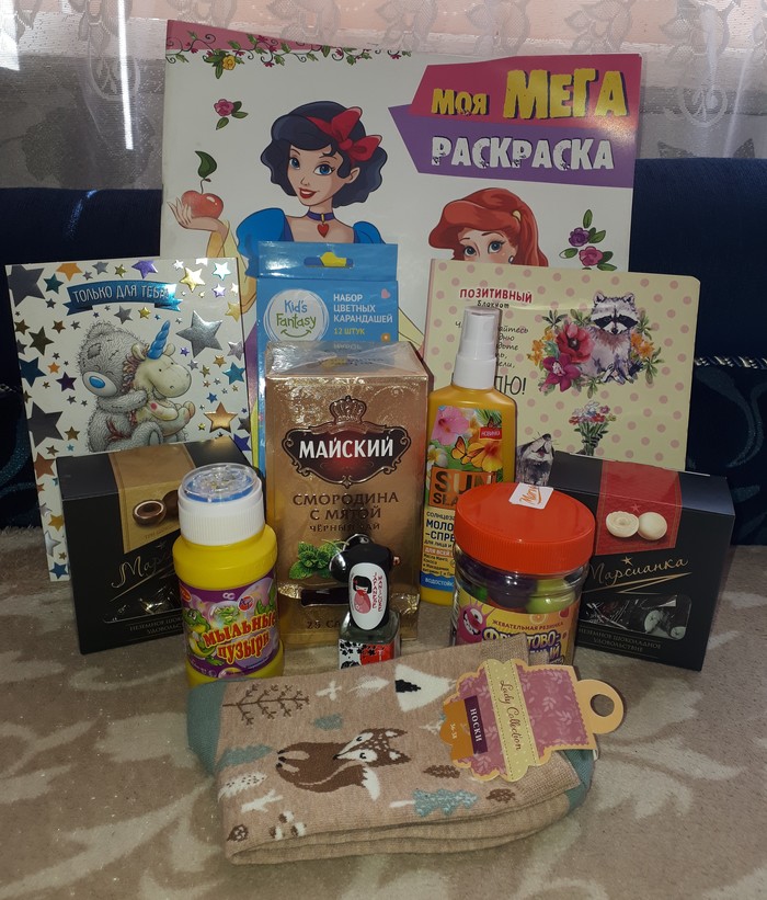 А еще конфетки; чай классный; жвачки, только глядя на которые, настроение поднимается; раскраска с карандашами-теплыми осенними вечерами будет, чем заняться.