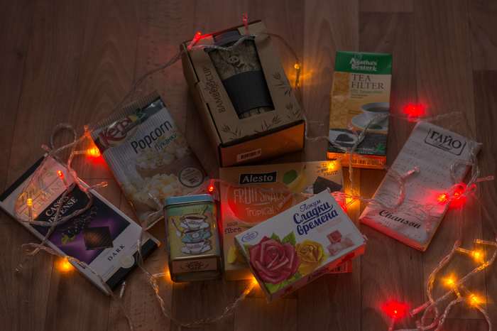 Куча сладостей, попкорн, рахат лукум (его я просто обожаааю, прям попадание 100%), шоколад, придется посленовогоднюю диету еще отодвигать ради таких то сладостей :))