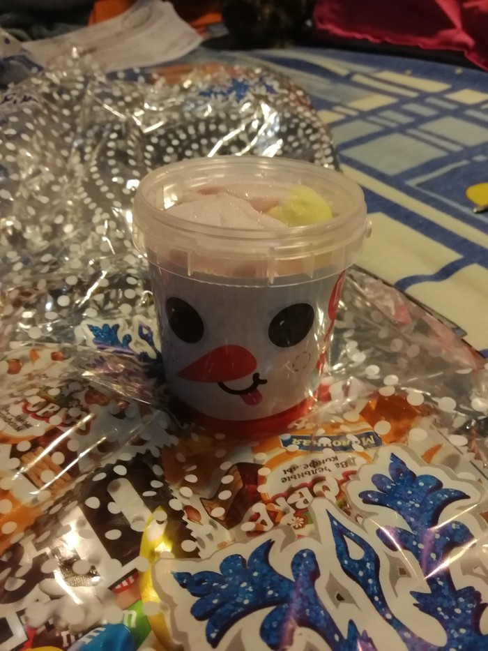 Большой пакет вкусняшек и забавная баночка с зефирками.