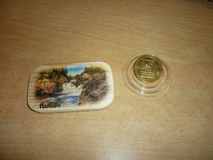Потом идет магнитик и брелок-монетка Петрозаводска.  Магнитик идет прямиком на холодильник(Петрозаводска там не было еще), а монетка брелок дочке в коллекцию монеток. У нее их много всяких- целая коллекция. Может если разрешит - пост как нибудь оформлю