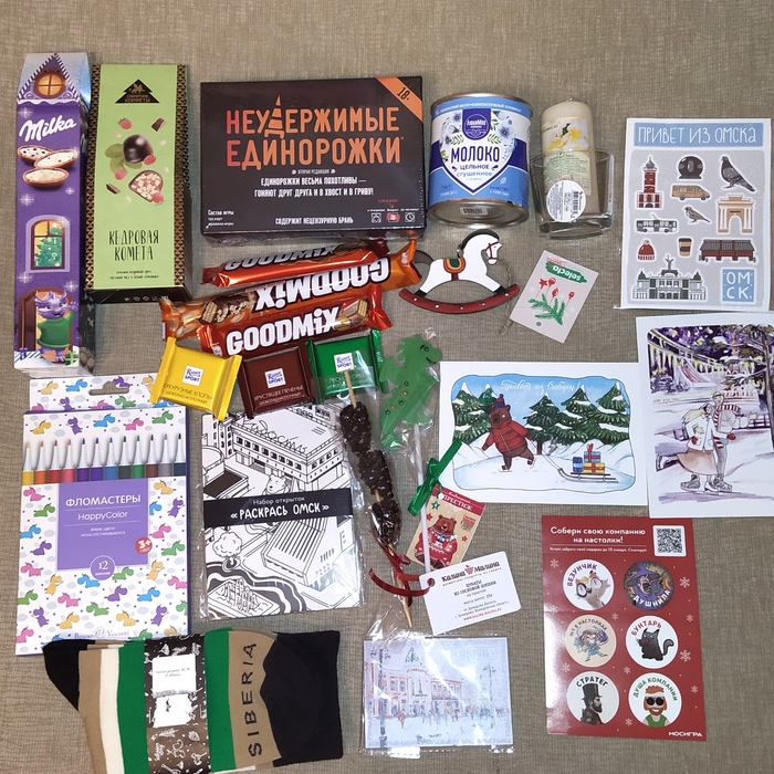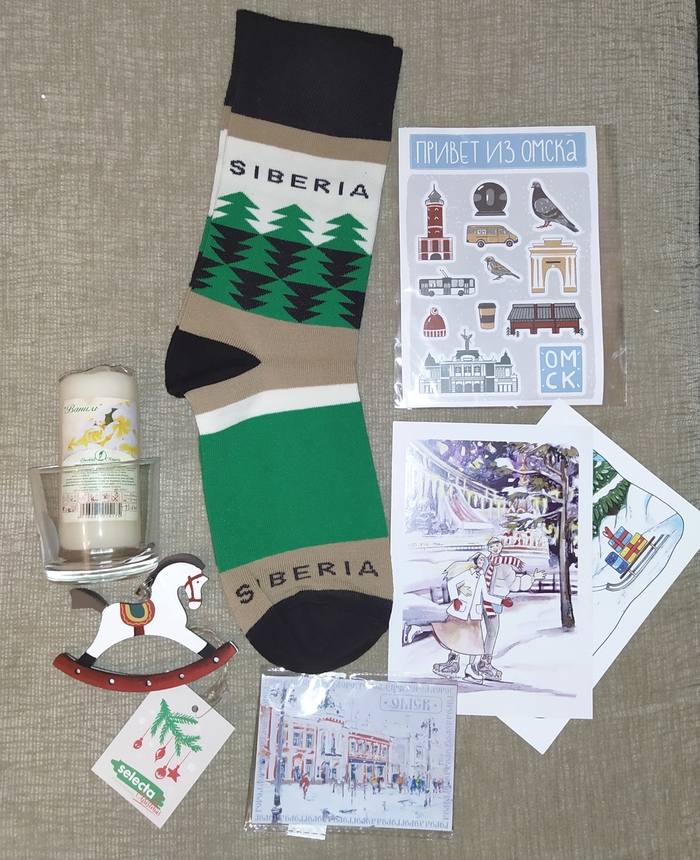 Местные сувениры, даже тут снегурочка учла интересы - мою любовь к лошадям, носочки, запах ванили, магнитик, душевные открытки всё это я указывала в анкете)
