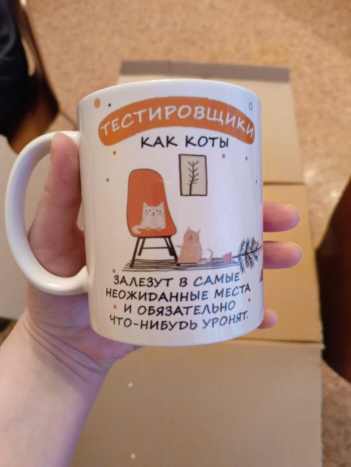 В коробке оказался бокал, с надписью "Я - тестировщик, мне можно" Какая же полезная вещь!!! До выкатки билда буду из него бокалами пить валерьянку, после - вишнёвый сок. Или не сок) Я ж тестировщик, мне можно 😁😁😁
