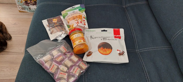 В начале октября, в комментариях к одному из постов по гастрообмену, обменялись контактами с девушкой насчет обмена вкусняшками. Мою порцию вкусняшек с традиционной сгущенкой и вафельками из Беларуси она получила еще неделю назад. И вот, наконец-то дождалась свою порцию сладости. Как только прозвучал заветный звонок от почтальона: «Вам посылка из России, будьте дома», я пошла ставить чайник. И не прогадала. Вот теперь сижу, пью брусничный чай с облепиховым вареньем, закусываю имбирным пряником, а компанию мне составляет милый плюшевый осминожка. Спасибо @helya за душевно собранную посылку. У меня тоже глаза разбегаются с чего начать: меда с киви или клюквой, варенья из шишек или облепихи. А чая мне так вообще на год хватит!
