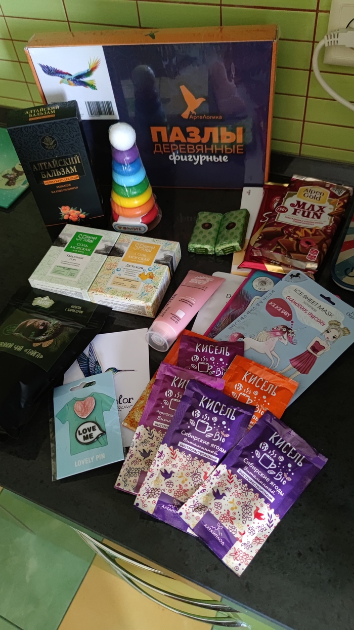 Итак. Начну с ништячков местных, которым я как ребёнок обрадовалась больше всего: марципановые конфетки, чай, бальзам, соль для ванны и кисель (такой первый раз вообще вижу быстрорастворимый). Я не знаю как, но отправитель угадала на 100% с пирамидкой для дочери (ей 7мес, указывала в анкете), у неё есть большая пирамидка, но ей явно в ближайшие пол года будет вообще не удобно ей играться, хотела ей маленькую купить, чтобы ей было удобно учиться её разбирать/собирать, а тут вот она, в посылочке) так же дочери досталась детская соль для ванн) потом мои девичьи радости в виде кремушка (тоже алтайский, кстати) и масочек. Шоколадочки для сладкоежки к чаю, пару прикольных значка (на коляску прицеплю) и то, на что я очень давно смотрела, но никак не решалась купить - деревянные пазлы!