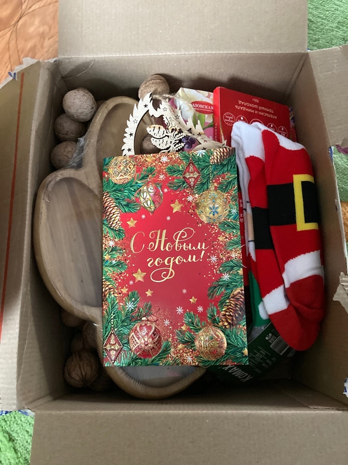 После того, как коты дали разрешение продолжать, добралась до содержимого. Очень классные игрушки (были доставлены детям, тот, что белый и с рожками, уже получил зимнее имя Снежок), колокольчик (мама коллекционирует их из разных городов и стран), брошь, магнитик, сыр (его к моему приезду уже не осталось, как я поняла 😅 но, говорит, было очень вкусно), сладости в новогоднем носке, сладости без носка, открытка (и та с шоколадом!), хлопушка и лакомства для котоинспекторов и пса-надзирателя)))