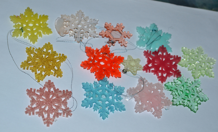 Снежинки осмотрел, вроде все целые. Какие-то с нитками, какие-то без.