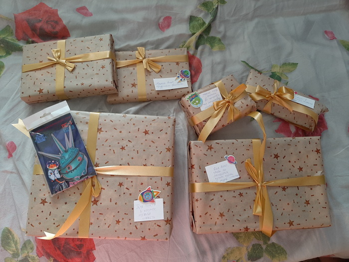 Кстати - упаковка подарка - это просто отдельная песня! каждый сверточек обернут ленточкой, подписан, с космической наклейкой (завидую белой завистью тем, кто умеет упаковывать подарки, я-то не умею от слова совсем). Итак, по-ехали!