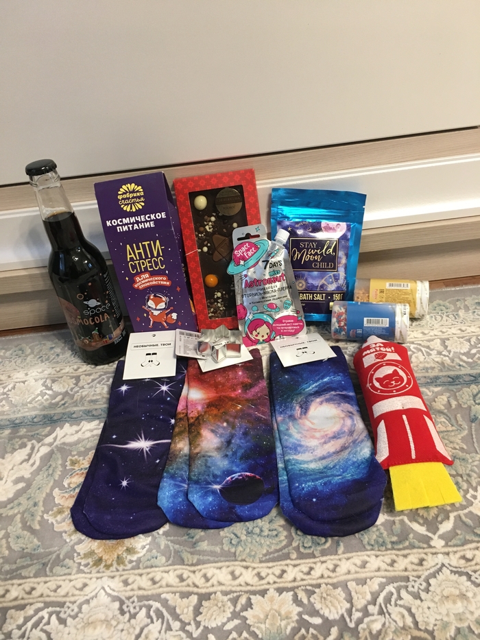 Следом идут разные приятности: милая ручка и стикеры для заметок (мало ли чего придется записать, чтоб не забыть), магнитные закладки и закладка с заметками (чтоб читать в космосе любимую фантастику), красивущий блокнот (вероятно, будущий бортовой журнал) и носки (чтоб в скафандре не мёрзнуть). Сначала думала, что носки будут маловаты, но размер очень даже подошёл)