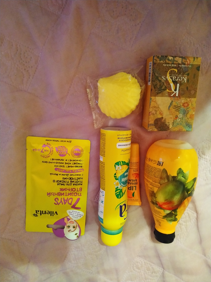 Штучки для тела. Гель для душа, бальзам для губ, дезодорант, бомбочка для ванн, маска для лица и очень ароматное мыло. У него очень вкусный и сильный запах)))