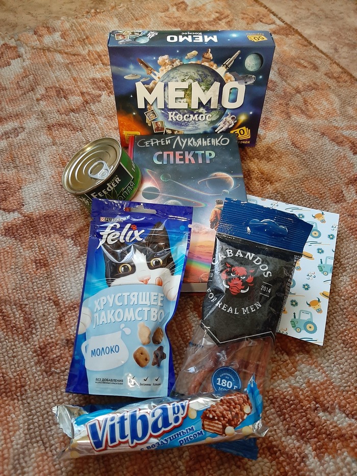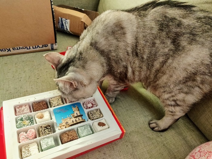 Вкусняши - коту, мяско - мне, белорусская шоколадка - сыну (внезапно проснулась котоинспекция))