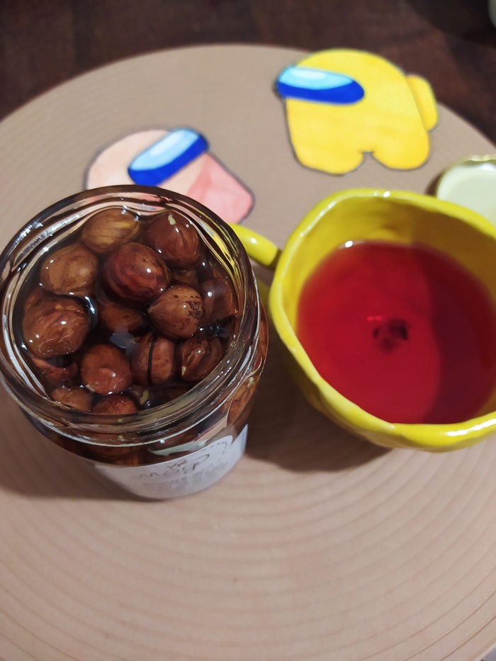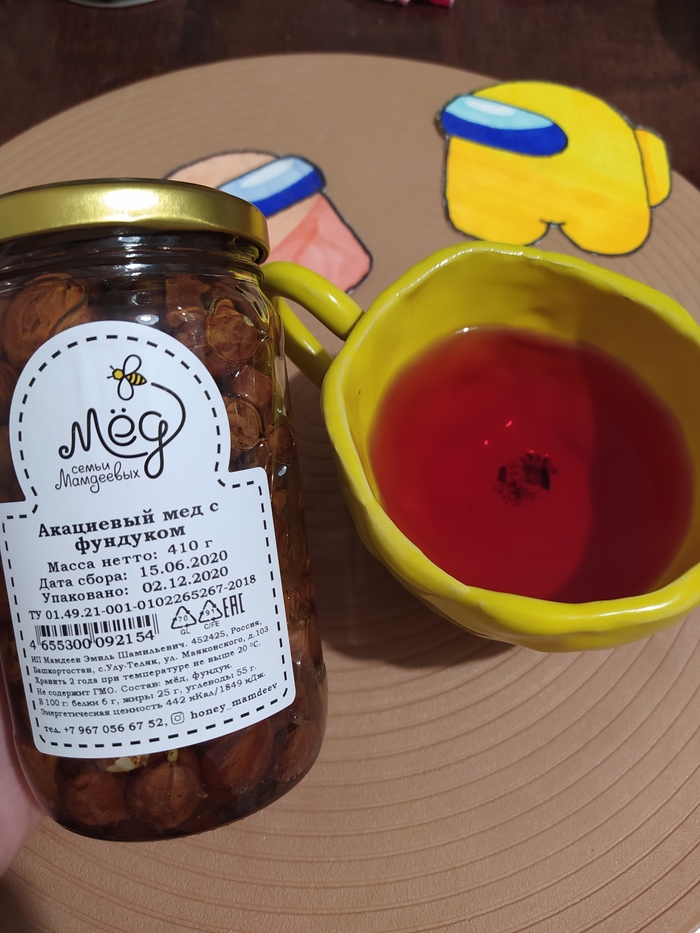 Чай, кстати говоря, восхитительный)) Ароматный, ягодно-фруктовый. А мёд! С фундуком! Мммм... Я в жизни такого не пробовала. Даже моя "яэтонеем" уплетала за милу душу.