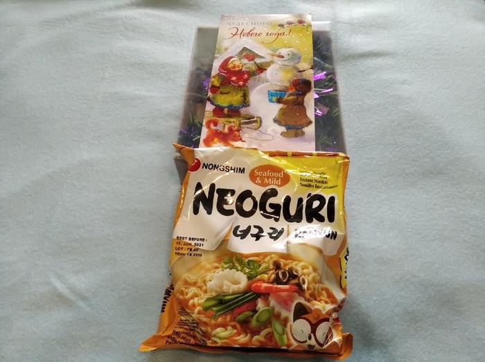 Красивая открытка с милым пожеланием от моего тайного Деда Мороза и загадочно-празднично упакованный рамён с морепродуктами :) Наверное не удержусь и сварю уже завтра!