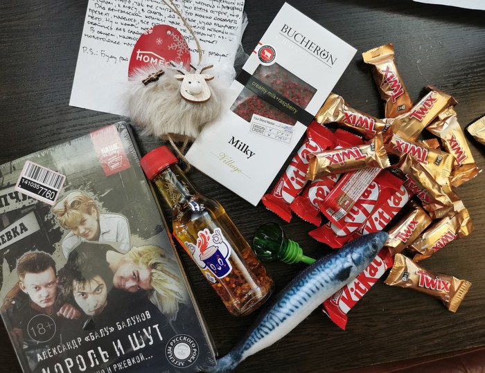 Ну а для меня там оказались не менее приятные подарки. Книжка про группу Король и Шут это 100% попадание! Очень люблю эту группу, с удовольствием почитаю! Так же самодельное масло, из острого домашнего перчика, чеснока и трав, это же бомба! И конечно же сладости и украшение на ёлочку.