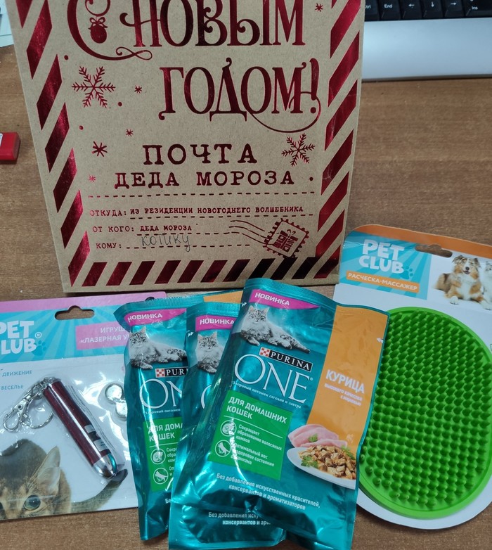 Не забыла моя Снегурочка ни про кота, которому достались игрушка (как раз недавно лазерная указка была уничтожена), чЁсел и пакетики