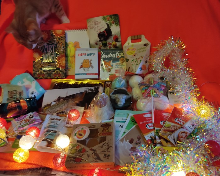 Ура-ура! Вот и мне приехала посылочка из столицы! Спасибо тебе, Снегурочка, за такой крутой подарок! В нем игра для развеселой компании, бутылка-непроливайка для походов, вкуснячие конфеты с пралине, в форме кофейных чашечек (жена в восторге), приправы грузинские, ароматныыыыеее! Готовить я люблю и точно знаю, что в скором времени их запах заполнит кухню! Еще для котоинспекции за их труды там были вкусняхи и еж-игрушка))))