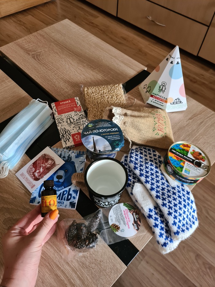 В посылке были конфетки, носочки, Таллинский алкоголь 🙈, маска для лица, мандарины в баночке, блокнотики и карандаши из Эрмитажа)