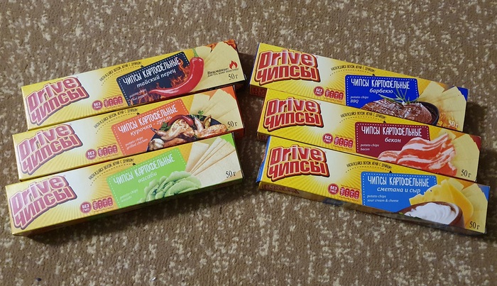 Чипсы с разными вкусами в коробочках, есть даже со вкусом васаби.