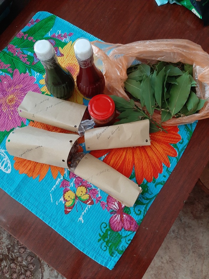Потрясающие соусы домашнего производства из киви и кизила (зеленый из киви замечательно зашёл с шашлыком)), домашняя аджика (просто огонь во всех смыслах))), свежесорванный лавровый лист (боже, как он пахнет!), и вкуснющие приправки (я - безумный фанат всевозможных специй).