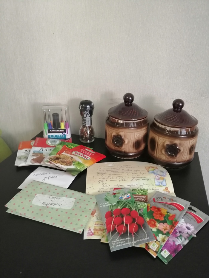 Огромное спасибо Альтруисту))). В такое странное время когда всё закрыто, особенно приятно получить такой классный подарок.  Я доволен как слон=) Сам же подарок включает в себя набор отверток, что всегда кстати))) Семена как раз к сезону. На даче станет ещё красивее и в салат будет что нарубить) Набор различных специй и два замечательных горшочка со сладостями ^_^. А так же таинственный конверт с рецептами которые я конечно попробую повторить)