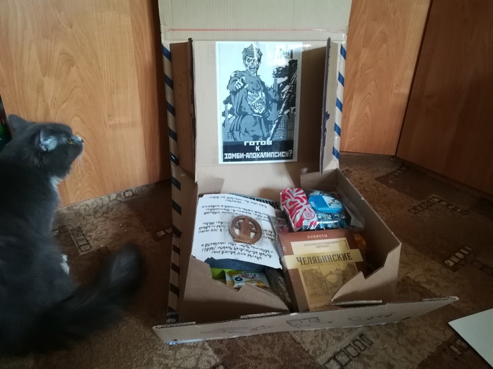 Внутри оказалось очень много вкусностей, книга про моих любимых зомби, магнитики с Челябинском, вкусности и игрушка для котоинспектора.