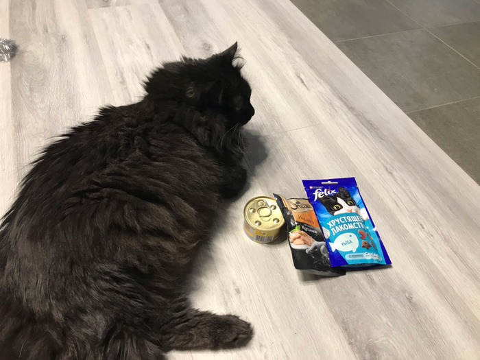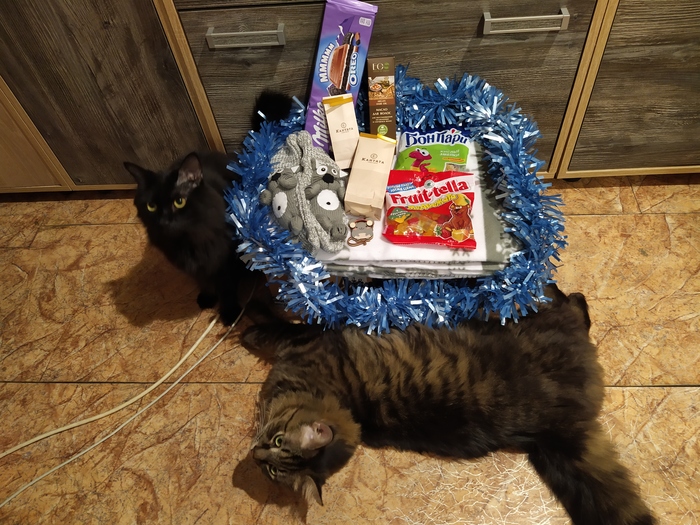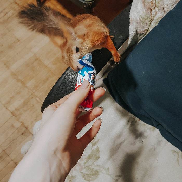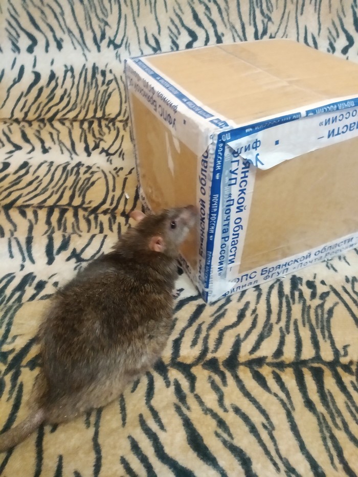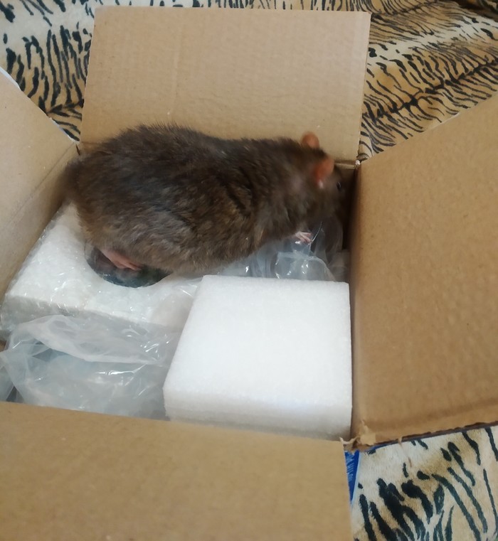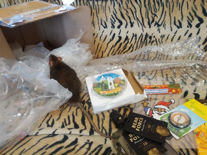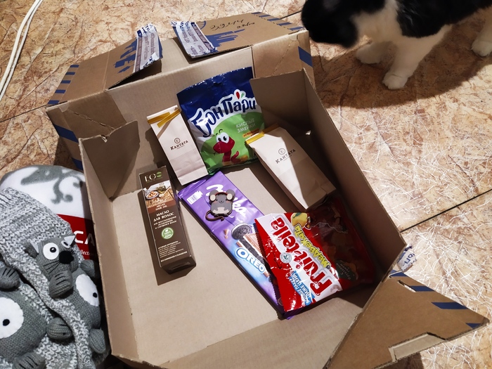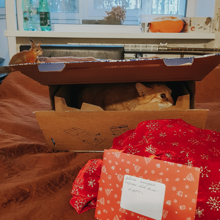 Увы, кошка подарком не заинтересовалась и сразу забрала себе почтовую коробку, а вот бельчонок попросил угоститься конфеткой))