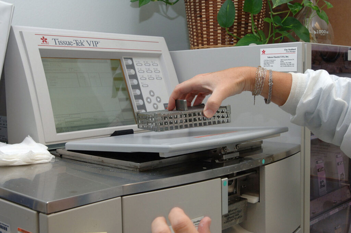 Для биопсии используются дорогие машины, такие как тканевый процессор, автоматическая машина, которая постепенно обезвоживает ткань и пропитывает ее расплавленным парафином. Предоставлено Эдом Утманом / Wikimedia Commons