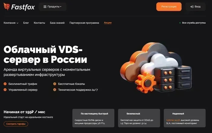 Стартуют от ~299 ₽ в месяц, у старших — до 1 Гбит/с. Анти‑DDoS и автоматические копии создают ощущение «страховки» — полезно, когда в ночи кто‑нибудь прилетит с любопытством к вашему API. Для небольших команд — приятный баланс стоимост и спокойной эксплуатации.