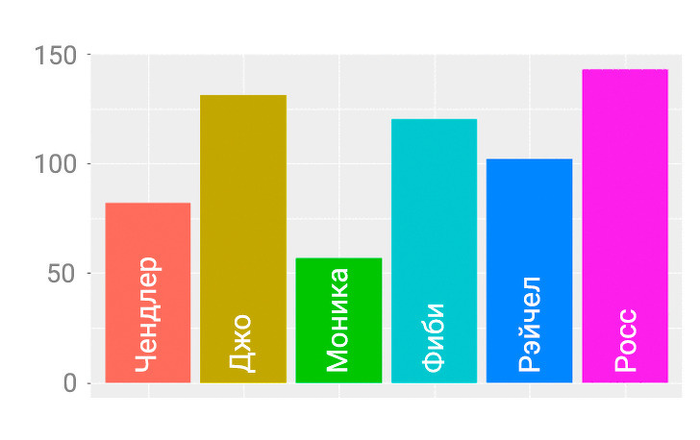 Цифры и графики позволили исследователю сделать объективный вывод: ведущий персонаж «Друзей» — это Росс. Именно у него больше всего самостоятельных сцен, он же входит в тройку лидеров по количеству слов, времени в кадре и другим показателям.
