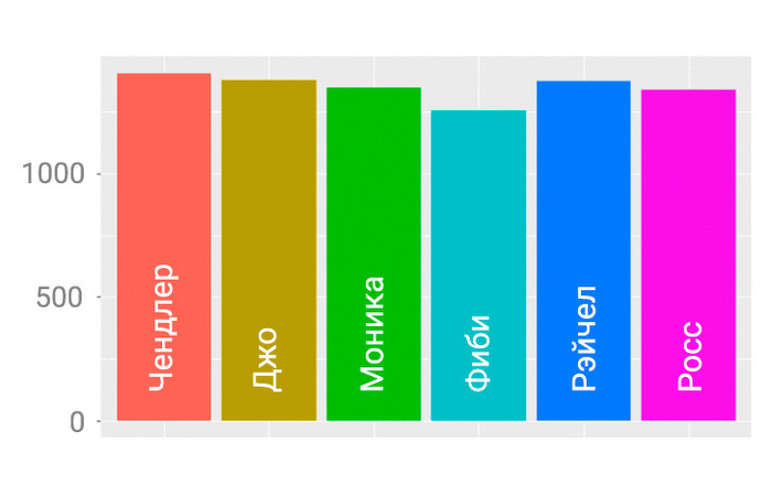 1-е место по этому показателю делят Росс и Рэйчел — во многом благодаря своему роману, за которым мы наблюдали в последних эпизодах. Каждый из этих персонажей произнес на экране около 100 тыс. слов. Самой неразговорчивой оказалась Фиби: у нее почти на 15 тыс. слов меньше, чем у лидеров. В целом экранные диалоги распределены между персонажами довольно сбалансированно, явного перекоса нет.