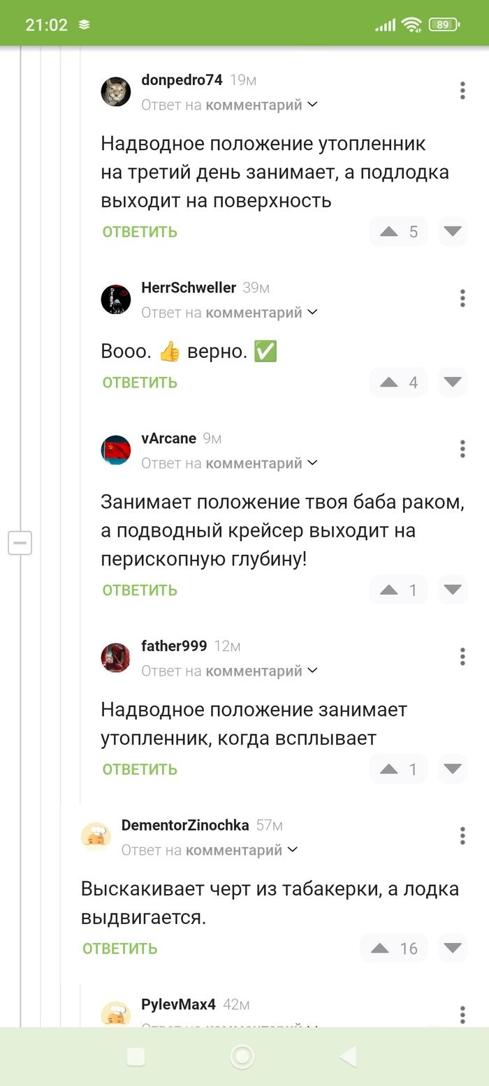 56 perxurov Скриншоты комментов Когда решил прочитать пост, а настроение сделали комментарии ;) 6 месяцев назад Это сама статья 👇 Что я могу рассказать после 15 лет службы на атомной подводной лодке Показать полностью 2 Статья Комментарии Комментарии на Пикабу Хорошее настроение Скриншот Длиннопост 4 1 Ещё 0