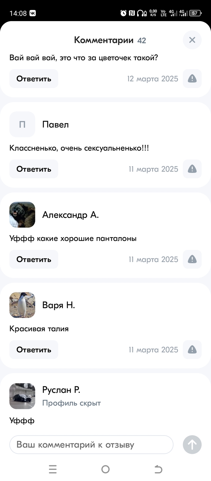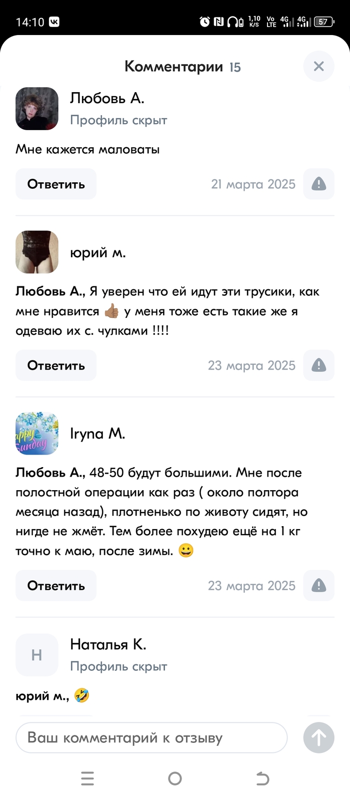 Вообще моя ж носит только стринги, ей удобно. Я попросил носить иногда другие, на что получил ответ "выбирай, вот размер , оплачивай" Пошёл на озон смотреть ассортимент. Даваа модели жоп симпотные, но мне же надо знать как на любимой жопке будут смотреться эта модель... И заходим в отзывы, жмем фотки, в наше время туза показать для девушек как сигаретки стрельнуть... Спасибо им конечно все наглядно и черт меня дернул зайти в в комментарии к отзывам...