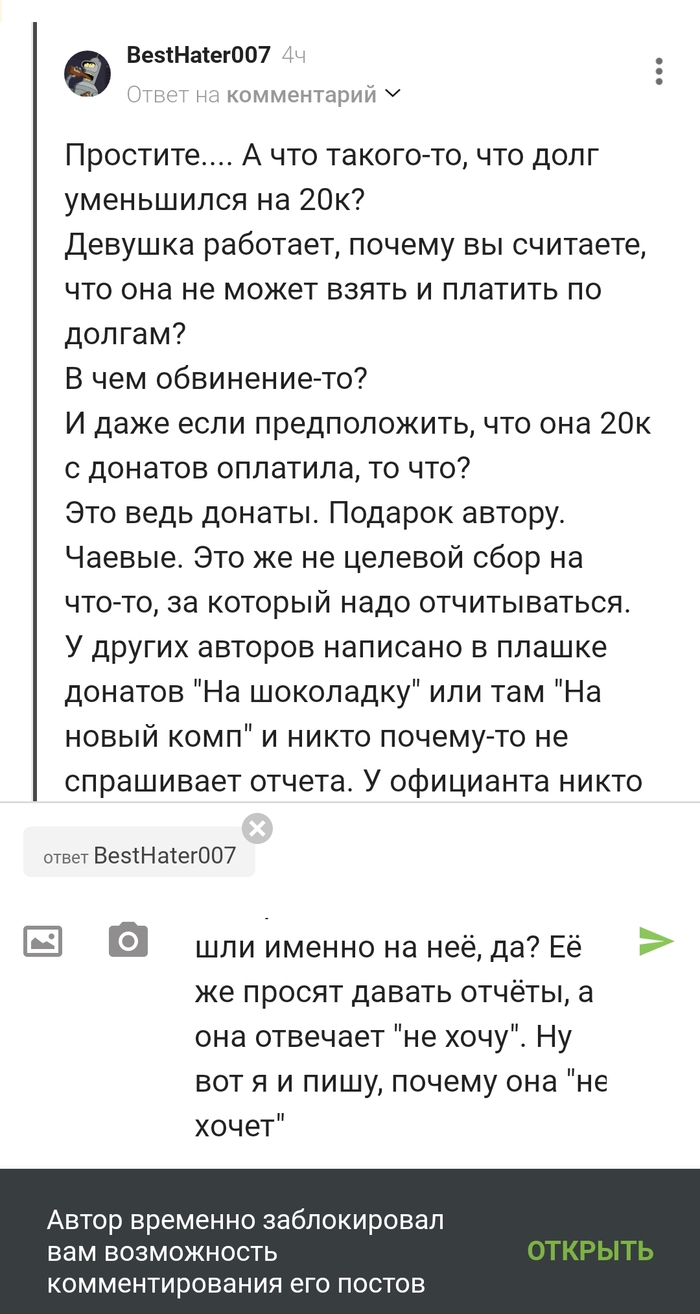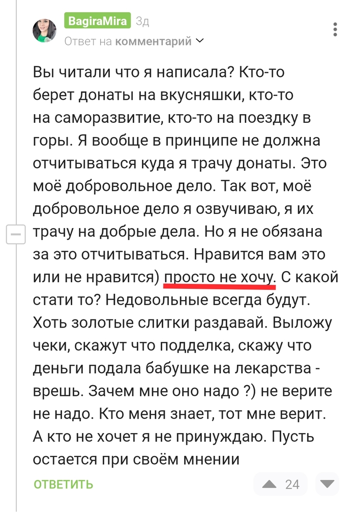 Только вот люди, когда читают про благотворительность, хотят наверно чтобы их донаты шли именно на благотворительность, да? Её же просят давать отчёты, а она отвечает "не хочу". Ну вот я и пишу, почему она "не хочет".