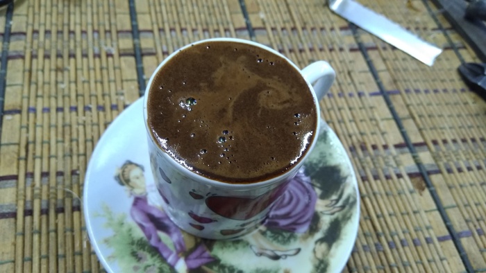 Люблю я кофе. Настоящий, в турке, на медленном огне и на сырой воде. Рецепт классический, ложка кофе, ложка сахара и чашка воды. Стабильный вкус, а вот рисунки в чашке всегда разные ))