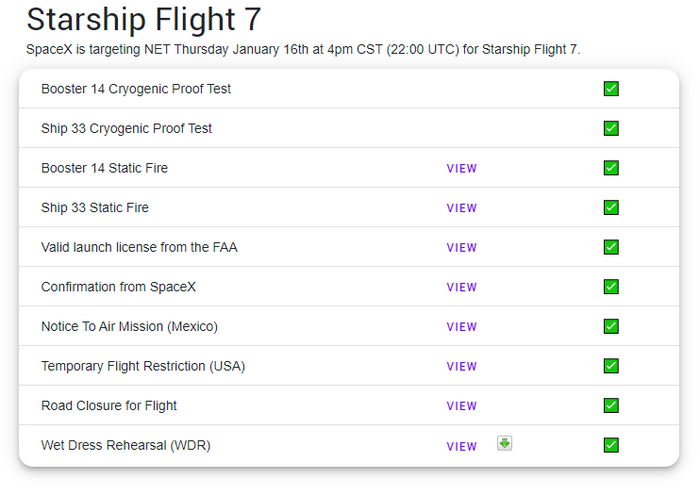 SpaceX is targeting NET Thursday January 16th at 4pm CST (22:00 UTC) for Starship Flight 7.