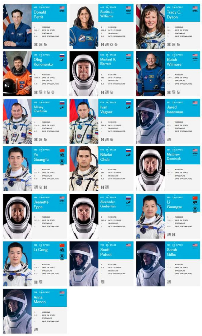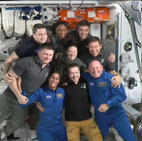 9 человек на борту МКС (Суннита Уильямс и Барри Уилмор прилетели на недельку и застряли) и еще 3 на борту китайской станции «Тяньгун».