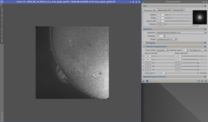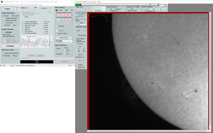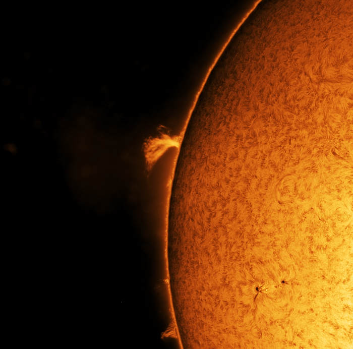 Открываете другую программу. Закрываете диск солнца маской (чтобы его не пересветить) и тащите гистограмму, чтобы проявить протуберанец.