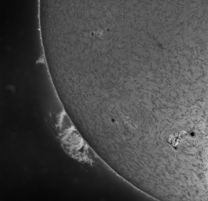 Если вы наведете солнцескоп и просто сфоткаете, то получается не очень красиво - какое-то непонятное и серое месиво. Потому что ваша камера черно-белая. Смысла брать цветную, когда снимаете только сигнал водорода H-альфана длине волны 656 - нет. Еще и темно очень будет.