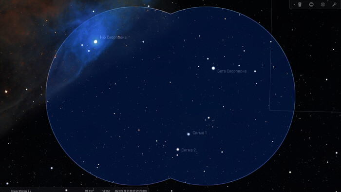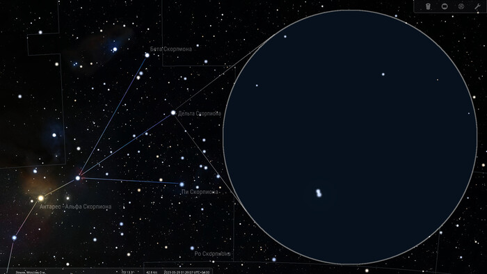 Это та самая звезда, которую не всегда относят к “Клешням”, а в средних северных широтах он наблюдается с трудом, ведь её склонение составляет -29 градусов, и, например, в Москве Ро Скорпиона не поднимается выше 5 градусов над горизонтом. К тому же эта звездочка слабее остальных звезд астеризма — 4-й звездной величины. Но при наблюдениях в субтропиках и южнее, желательно в горах, она прекрасно дополняет очертание “Клешней Скорпиона”. И когда однажды это увидишь, понимаешь, что без Ро Скорпиона уже не воспринимаешь эту звездную фигуру.