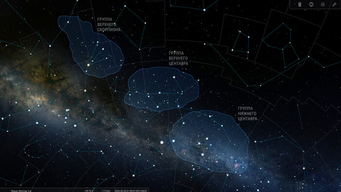 В галактическом масштабе мы имеем дело с так называемой OB-ассоциацией Скорпиона-Центавра, состоящей из нескольких тысяч звезд, образовавшихся в одном гигантском молекулярном облаке несколько миллионов лет назад (динозавры их еще не видели). После тщательного анализа характеристик тысяч светил, астрономы разделили эту звездную ассоциацию на три потока: