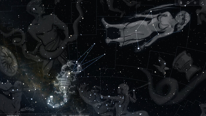 Выглядывающий из под горизонта средних северных широт Скорпион, в окружении других летних и весенних созвездий