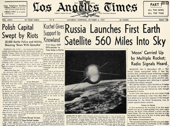 На следующий день американские СМИ принялись нагнетать панику. Заголовки газет и журналов были один другого краше: "Это поражение должно быть последним", "Почему красные первыми запустили его?", "Самая большая победа Советов", "Триумф коммунизма", "Эре нашей самоуверенности пришёл конец" и т.п. Впервые сомнению были подвергнуты американские достижения в науке и технике. Узнав про небывалое — запуск спутника, — десятки тысяч людей по всему земному шару, в том числе и американцев, выходили вечерами из своих домов, чтобы вместе наблюдать двигающуюся в небе точку — первый искусственный спутник Земли.