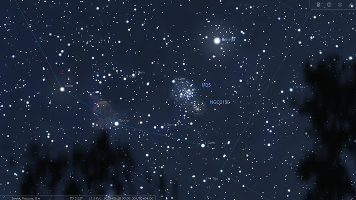 Венера проходит севернее рассеянного звездного скопления M35 в ночь с 9 на 10 мая 2023 года