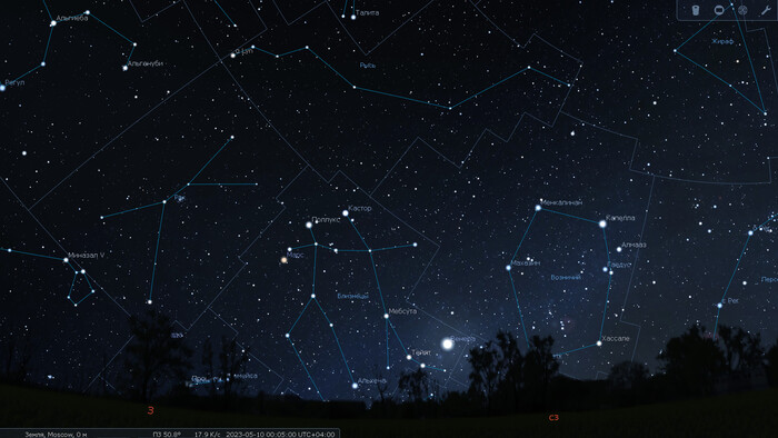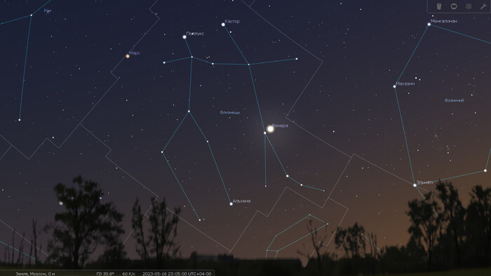 Венера в созвездии Близнецов в полночь с 9 на 10 мая 2023 года