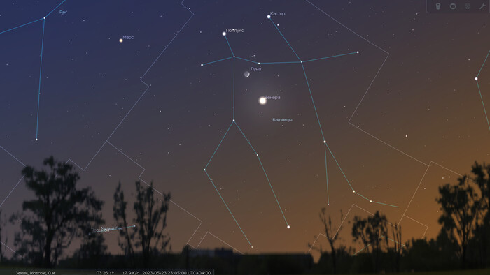 Майское свидание Венеры с Луной произойдет вечером 23 мая, и оно будет примечательно тем, что на небольшом участке неба соберутся сразу несколько ярких небесных светил: Венера, Луна, звезда Кастор (α Близнецов), звезда Поллукс (β Близнецов) и еще немного потускневший за весну, но все еще заметный и отчетливо красный Марс.