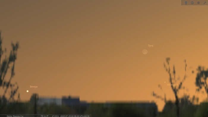 Венера, Луна и Меркурий вечером 19 июля 2023 года