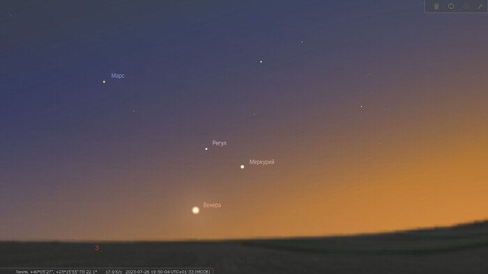 Жители Балканского полуострова и Италии еще успеют пронаблюдать тройное соединение Венеры, Меркурия и звезды Регул (α Льва) вечером 26 июля.