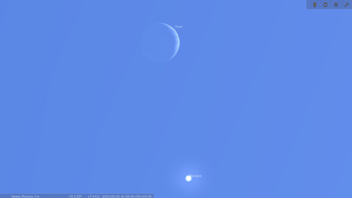 Ближе всего Луна подойдет к Венере в этот раз тоже днем — около 16 часов, но Венеру без особого труда можно будет заметить в легкую оптику или даже просто глазом в 1,5° к югу от Луны.